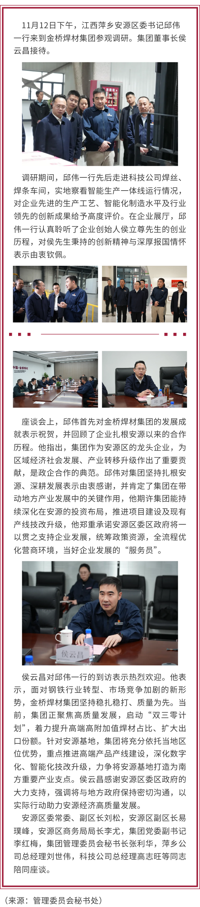 江西萍鄉(xiāng)安源區(qū)委書(shū)記邱偉 赴金橋焊材集團(tuán)參觀調(diào)研并深化項(xiàng)目合作